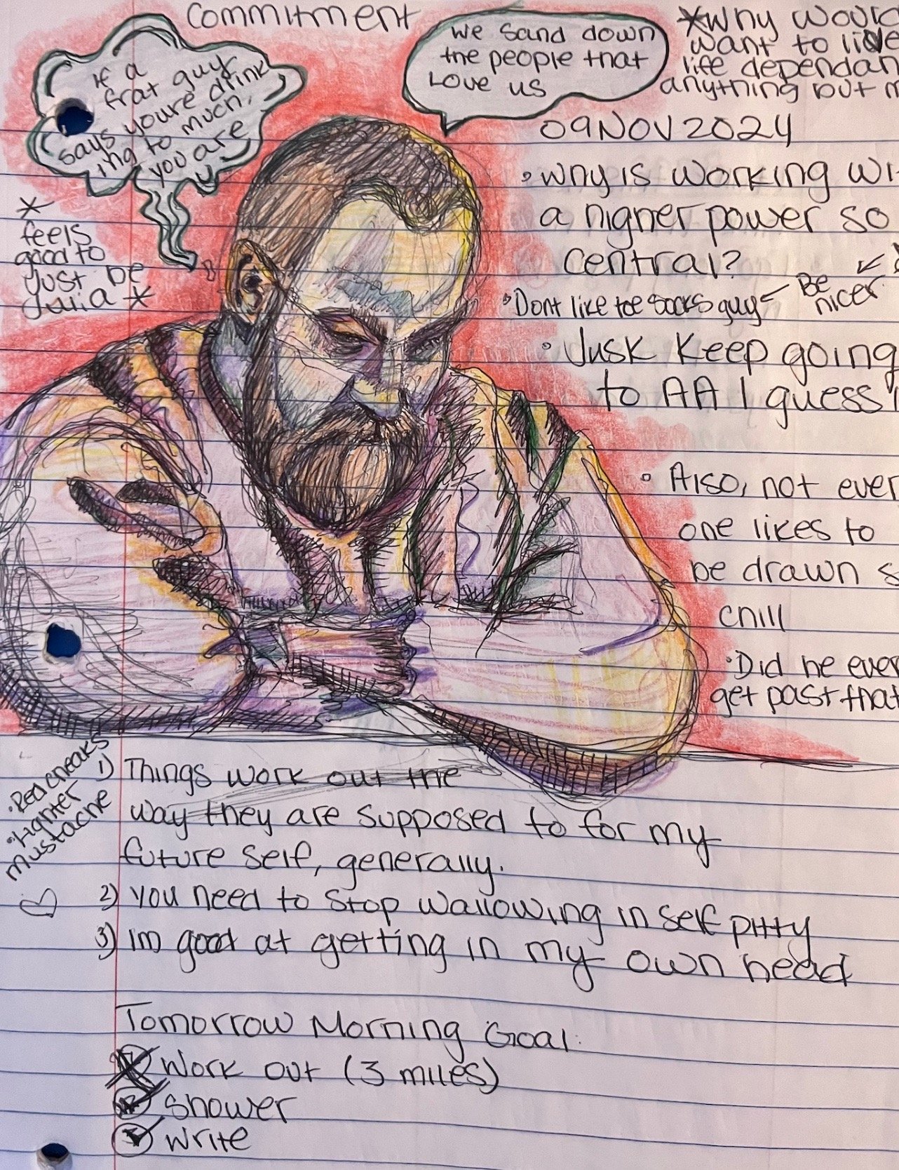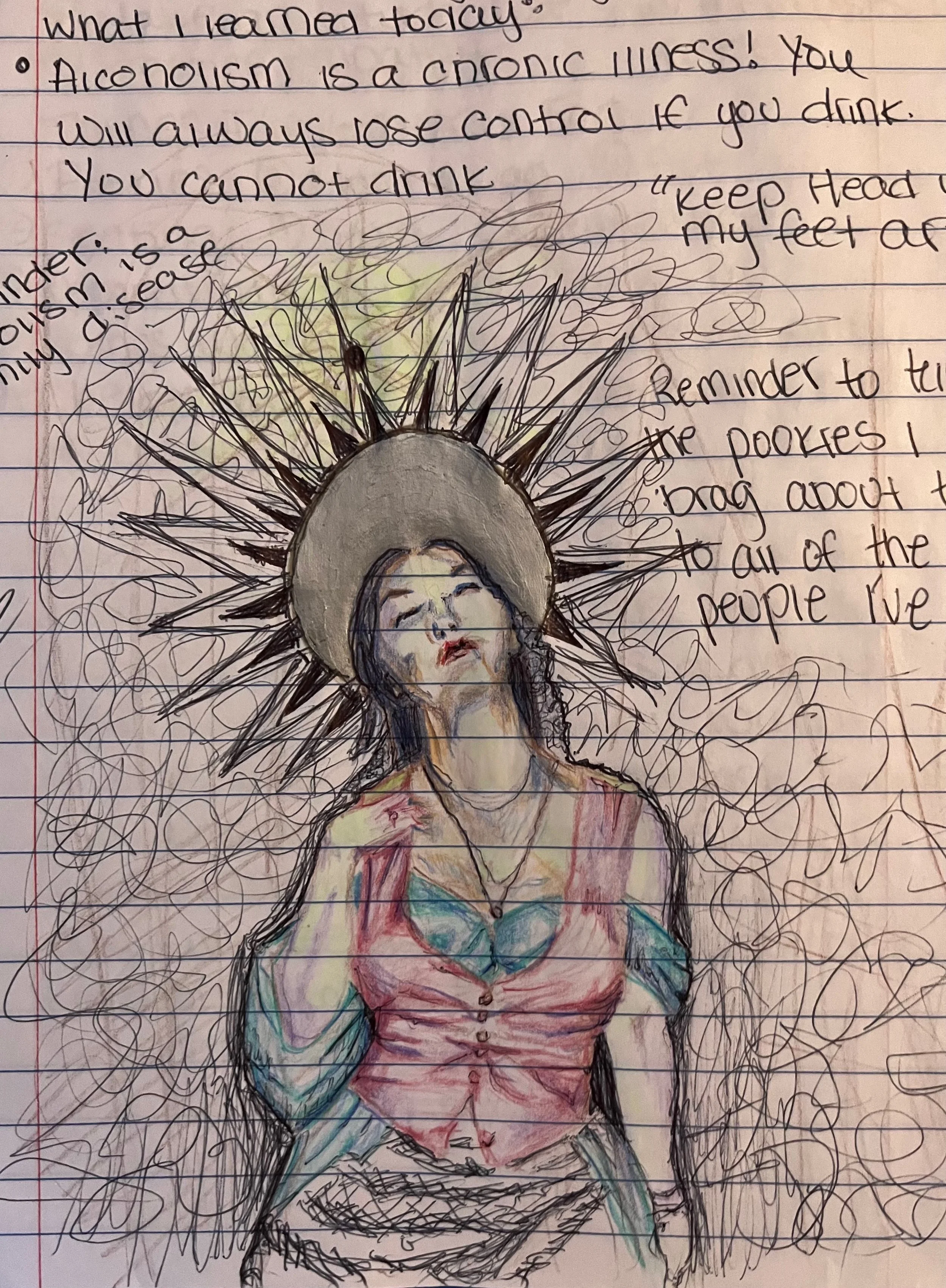 During the earliest days of my sobriety, I brought my notebook to every AA meeting, sketching the speakers as they shared their stories. These drawings became more than just portraits; they were a way for me to focus, connect, and process my own recovery. Each face reflects the weight of lived experience—some figures are rendered in deep blues and purples, mirroring a somber tone, while others emerge in fiery reds and oranges, capturing energy, defiance, or hope.