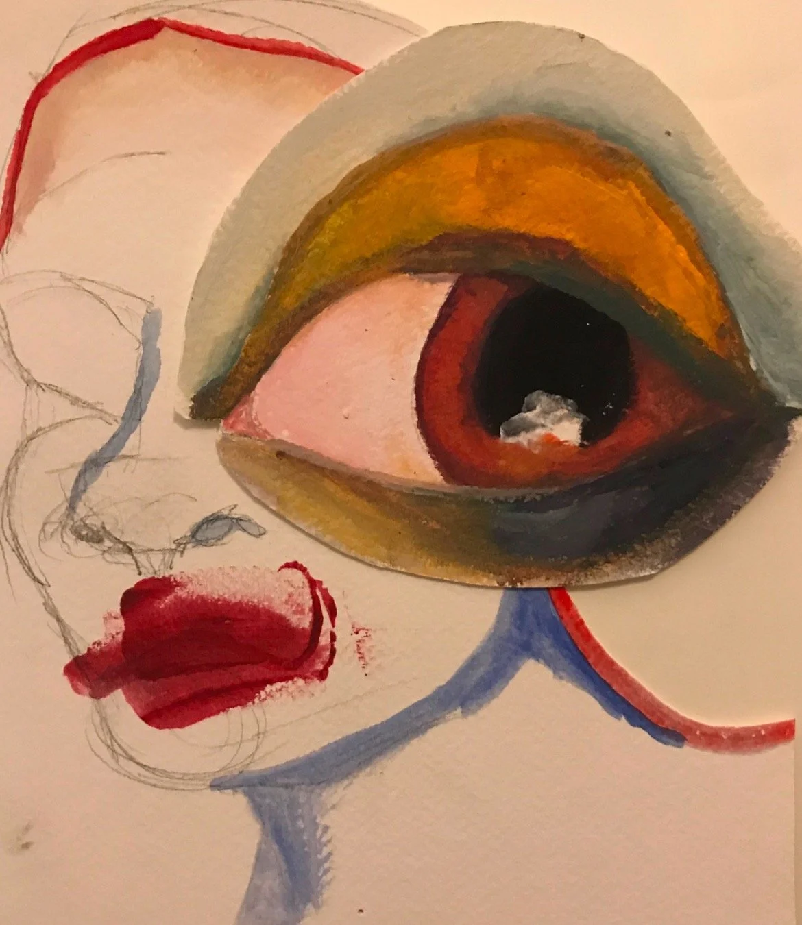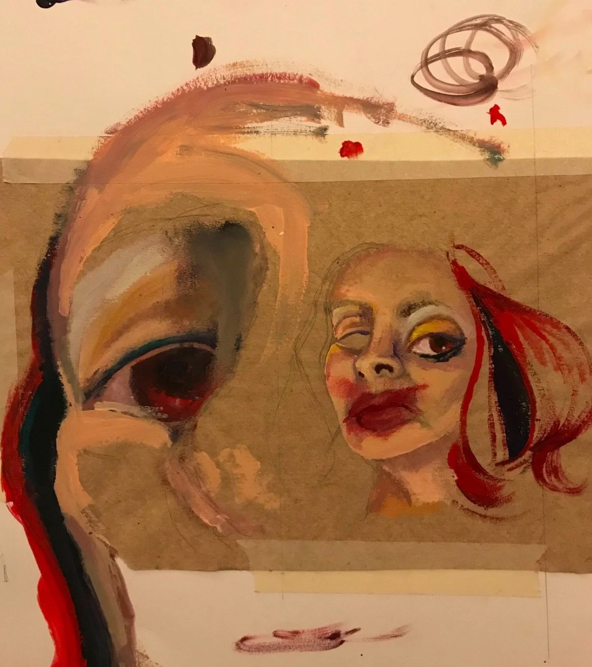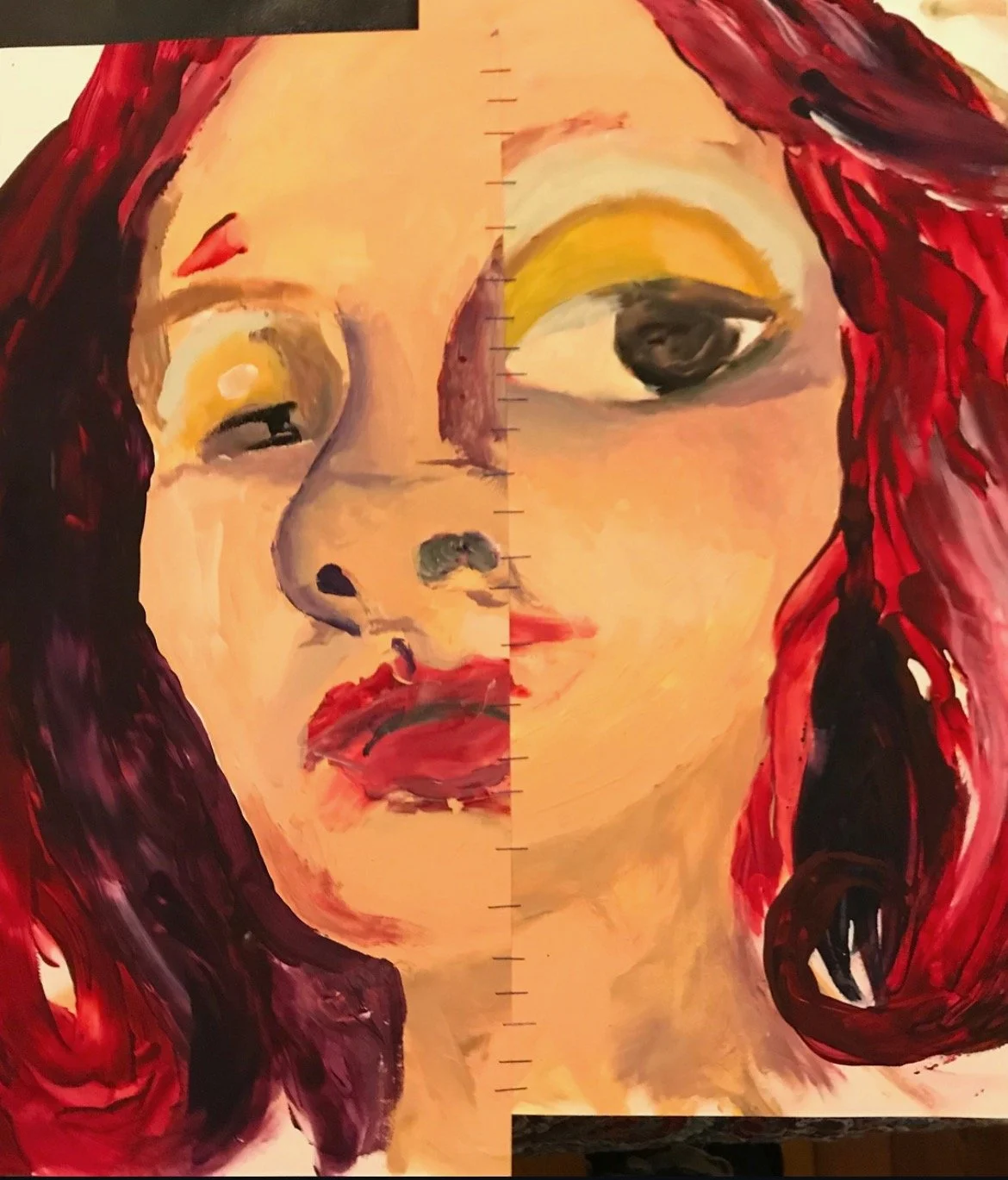 A striking portrait blending realism with abstraction, featuring a figure bathed in intense red light against a textured blue-green backdrop. Their upward gaze suggests contemplation or longing, while bold, expressive brushstrokes in the hair add movement and contrast. The unfinished edges and playful smiley face add a raw, spontaneous energy, balancing depth with a touch of whimsy.