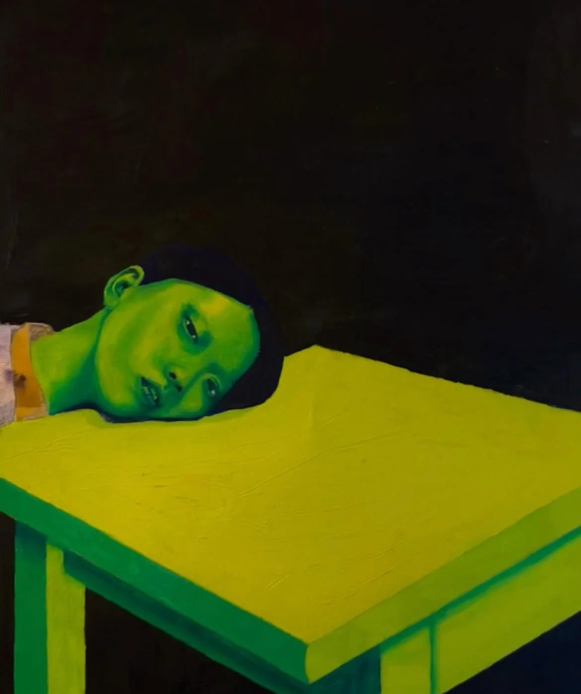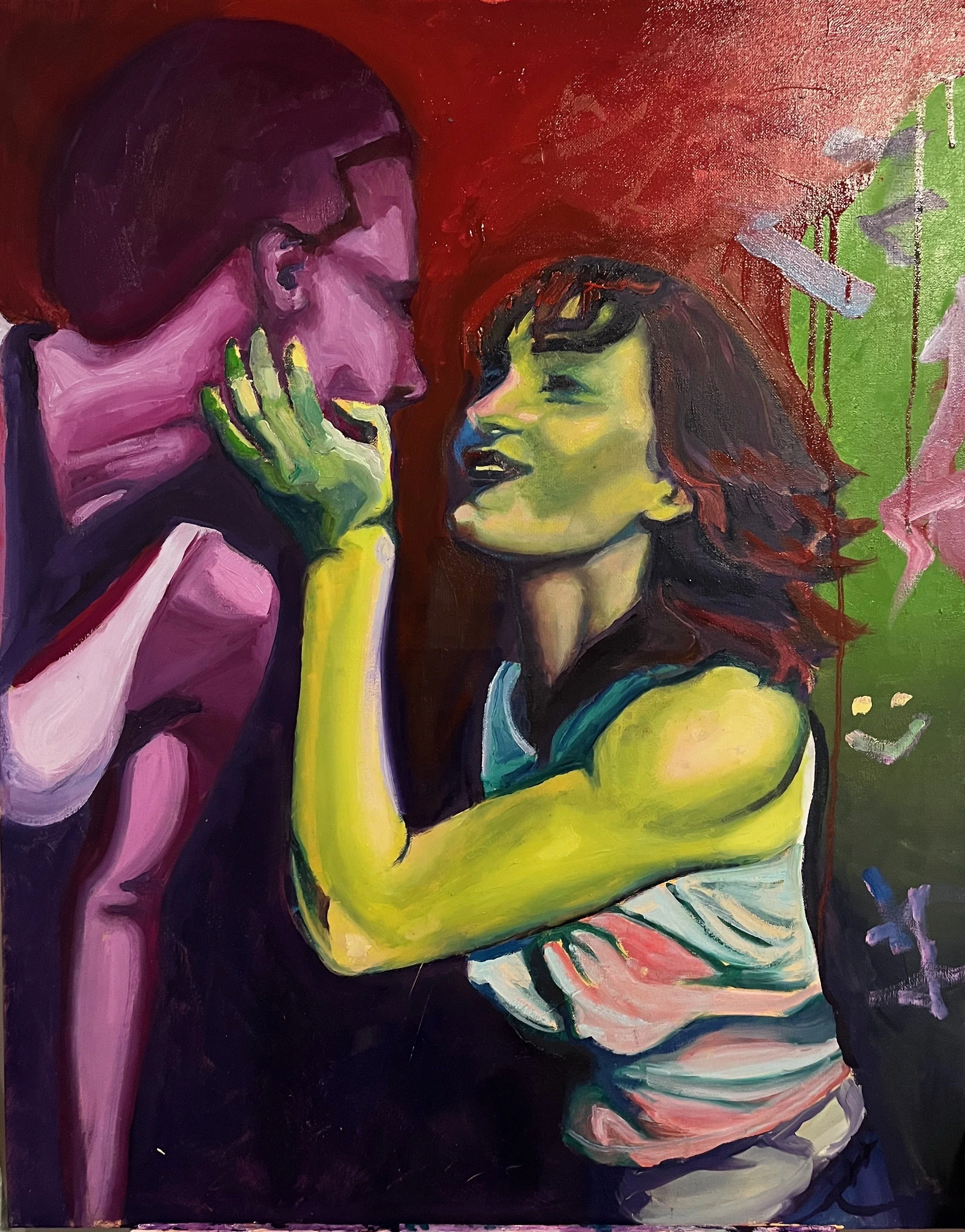 This painting is meant to evoke the disoriented, disjointed, and simmeringly chaotic mental state of someone who has shown up to work strung out. I’ve spent many days in the office in this condition—sweating coldly, choking against the too-tight collar of my blouse, physically agitated, emotionally exhausted, and spiritually barren. In sobriety, with painting as my lantern, I ventured into the cavern of my brain that contained the more morbid extremities of my addiction. My exploration led me to the realization that the essence of active addiction is that it’s actively killing you, and you can feel every moment of it, wherever you are. It feels like internal corrosion—like pressing your flushed, yellow-tinted cheek against the cold, clammy surface of your desk, your burning eyes drooping, your mind looping through waves of paranoia. You are dying, slowly, over days, weeks, and years, in the midst of a bustling office. That feeling is acrid, it is offensively green, piss yellow, ochre and blood-dark purple.