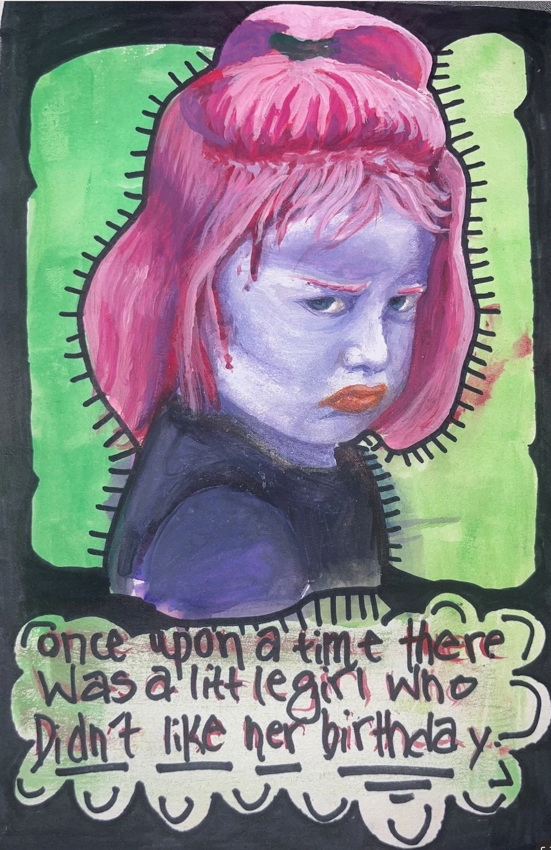 A moody, surreal portrait of a young girl with a piercing glare, painted in striking purples, pinks, and greens. Her hair, resembling a stitched-up wound or a decayed fruit, adds an eerie fairytale-like quality. The bold text below sets a darkly humorous tone: "Once upon a time there was a little girl who didn’t like her birthday." The expressive brushwork and unconventional colors enhance the tension between innocence and defiance, making this piece both unsettling and captivating.
