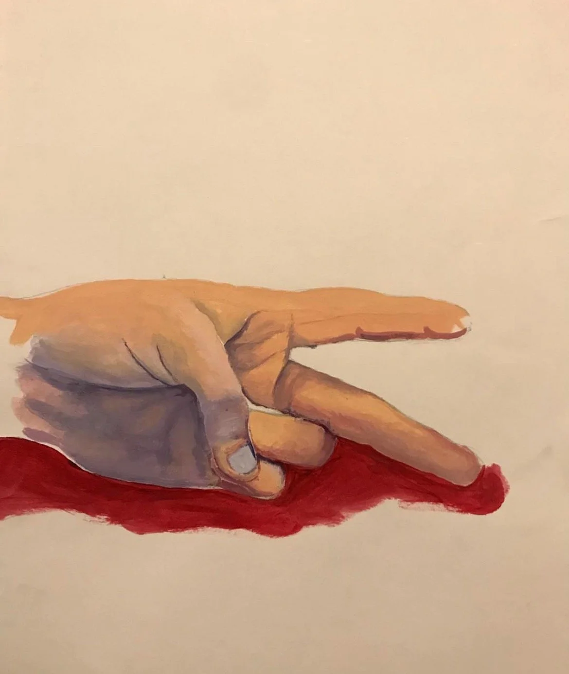 These three paintings form a striking visual narrative of tension, violence, and detachment. The first depicts a pair of red-handled scissors, rendered with precision and weight, their open blades suggesting anticipation or action. The second, more haunting, shows a lifeless hand resting in a pool of red, fingers curled as if caught in an unfinished gesture—evoking loss, consequence, or aftermath. The third returns to the scissors, now in grayscale, stripped of color but still charged with the same quiet menace. Together, these images tell a silent story of cutting, separation, and an unspoken violence that lingers beneath the surface.